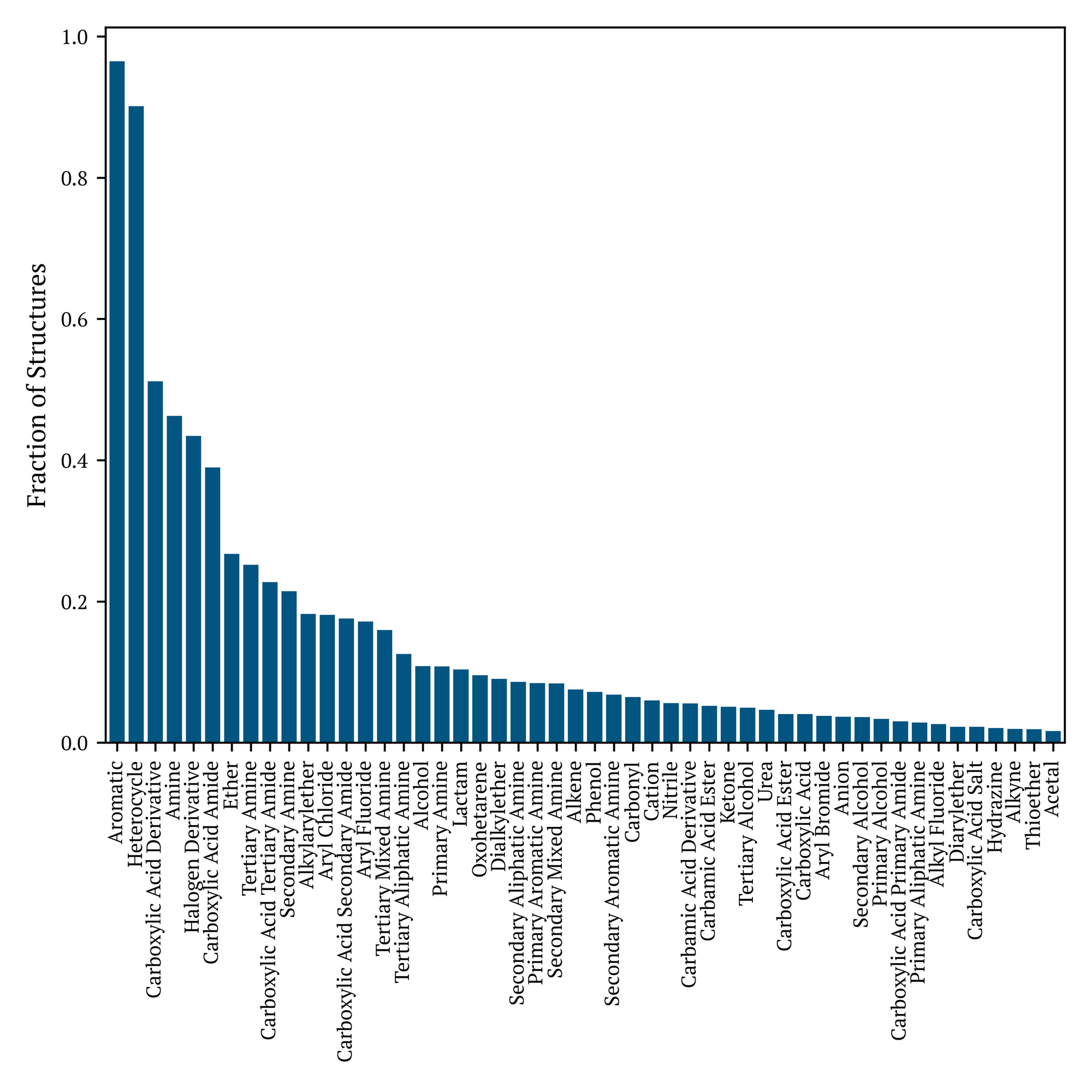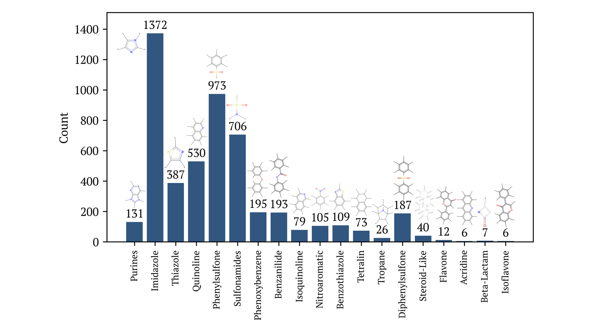 The contents of this dataset contains drug-like and biological scaffolds common in drug discovery efforts as shown in Figure 2. With 9,835 unique molecules, 3,760 can be categorized as one of the following: acridine, benzanilide, benzothiazole, beta-lactam, diphenylsulfone, flavone, imidazole, isoflavone, isoquinoline, nitroaromatic, phenoxybenzene, phenylsulfone, purine, quinoline, steroid-like, sulfonamides, tetralin, thiazole, or tropane. A molecule may be represented multiple times in this figure, where the identification of these substructures was achieved using the OpenEye Toolkit.