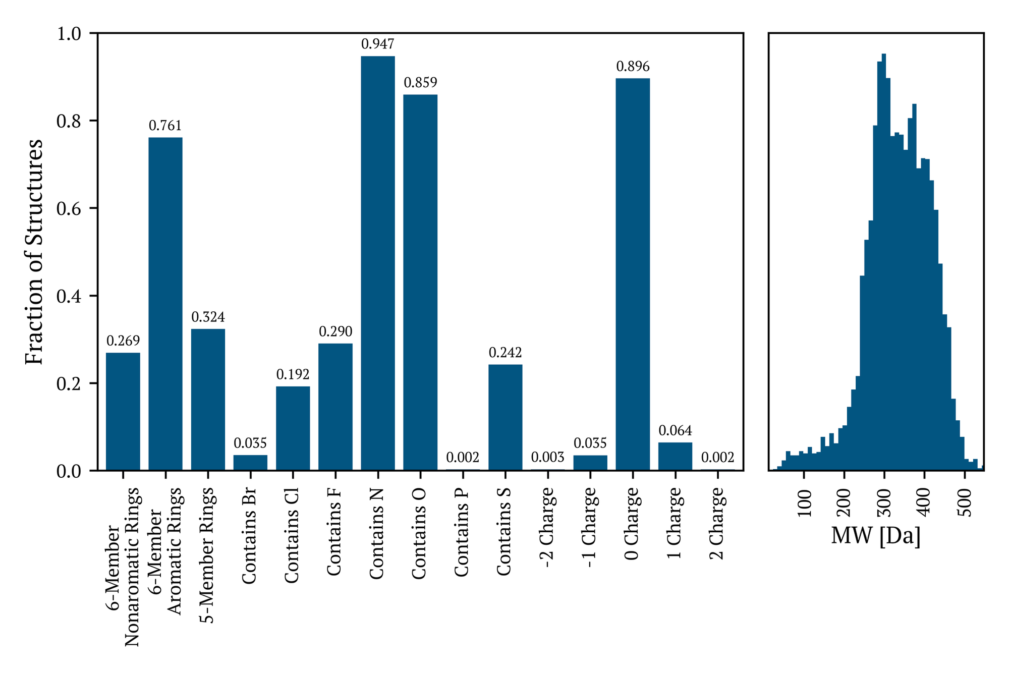 Although the remaining compounds do not possess moieties that precisely adhere to established drug-like scaffolds, they exhibit comparable structural motifs characterized by oxygen-, nitrogen-, and sulfur-containing hydrocarbon frameworks. Figure 3 illustrates the percentage of molecules in the full Industry Benchmark v1.2 that exhibit some element, ring type, or total molecular charge. These statistics are similar for the entire dataset and those remaining compounds that have not been identified as incorporating one of the assessed drug-like moieties. These molecules frequently incorporate single five- and six-membered ring systems (both aromatic and non-aromatic) and exhibit halogen substitution patterns. Each column in the left Figure 3 is adorned with the fraction of molecules in the Industry Benchmark v1.2 that contain these elements, moieties, and the distribution of total molecular charge. The right-hand side of Figure 3 presents the molecular weight distribution, with a minimum of 12 Da and a maximum of 1095 Da.